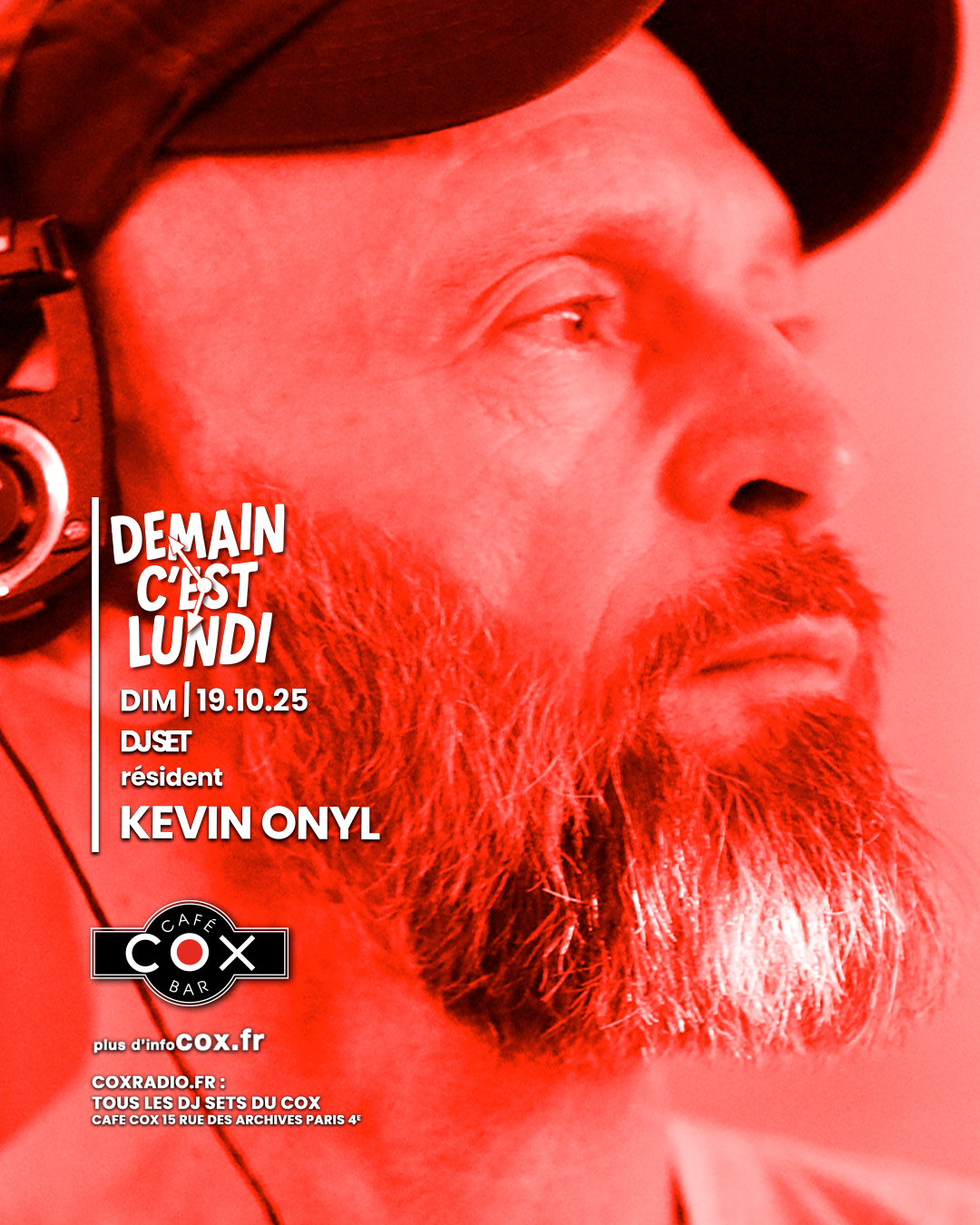 Tes clés tu oublieras, Ton café débordera ! ton réveil sonnera ! Ton mal au crâne reviendra …. tu ne pourras pas y échapper, « demain c’est lundi ! » alors autant nous retrouver au COX pour partager les derniers instants du weekend en bonne compagnie. l’Happy Hour sera NON-STOP jusqu’à deux heures. C’est kevin Onyl qui sera chargé de te faire oublier que « Demain c’est lundi » chaque dimanche au cox.