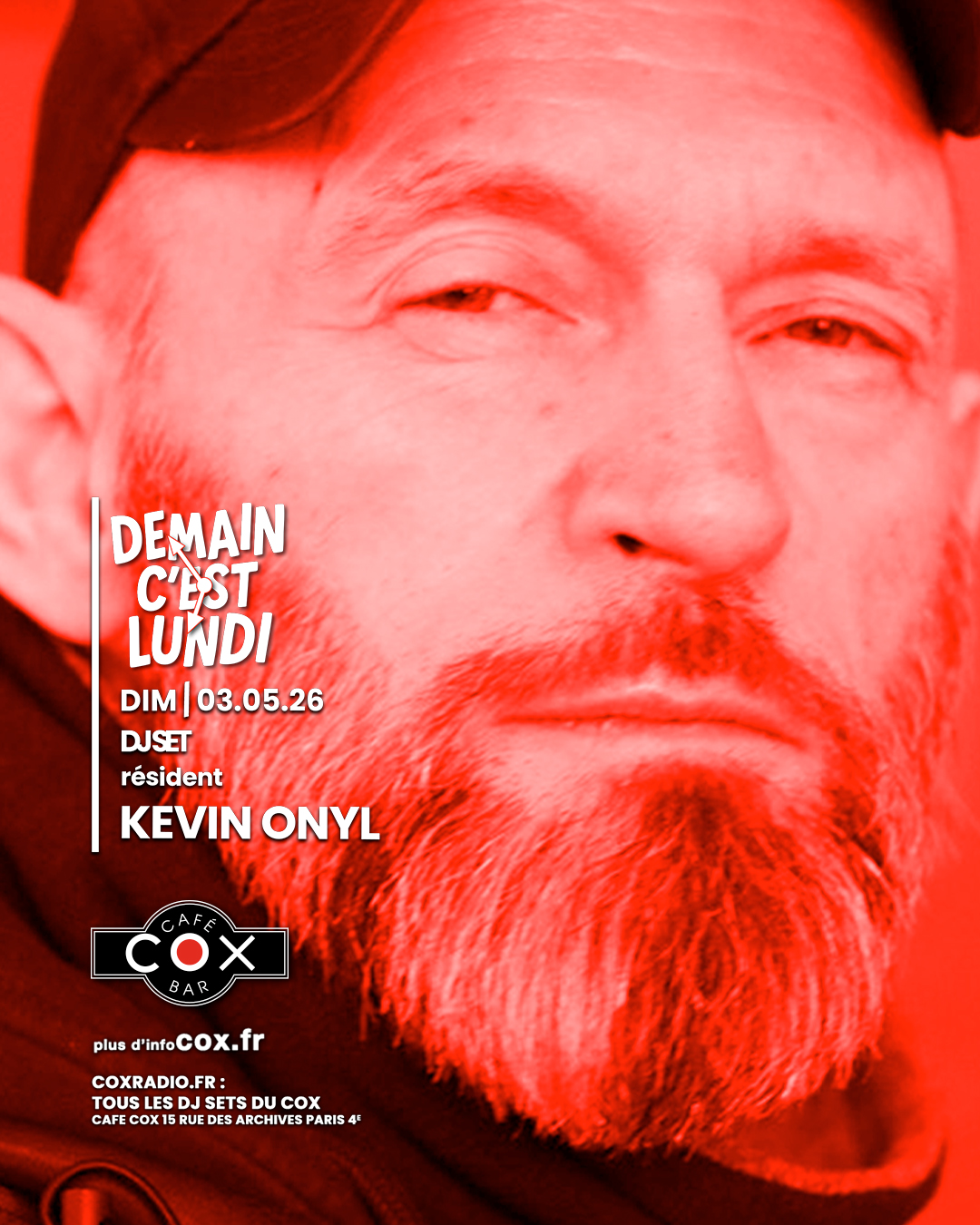 Tes clés tu oublieras, Ton café débordera ! ton réveil sonnera ! Ton mal au crâne reviendra …. tu ne pourras pas y échapper, « demain c’est lundi ! » alors autant nous retrouver au COX pour partager les derniers instants du weekend en bonne compagnie. l’Happy Hour sera NON-STOP jusqu’à deux heures. C’est KEVIN ONYL qui sera chargé de te faire oublier que « Demain c’est lundi » chaque dimanche au cox.